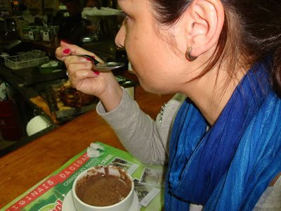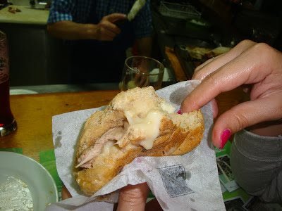 Ia a contar com um restaurante catita na esquina da praça dos Poveiros (por falar nisso, não se lembrem de morrer antes de provarem os poveiros da confeitaria Império na Rua de Sta. Catarina) mas deparei-me com um pequeno tasco tão típico como a própria ponte D. Luís com a Rita a esperar-nos à porta. Esperamos na fila em pé para pedir “o comer” e recomendados por quem já conhece a gastronomia do local pedimos uma sande de pernil com queijo da serra, umas papas de sarrabulho e um panaché “com pouca cerveja, se faz favor” só para dar o ar de quem está a beber um fino. Entretanto surgem 3 lugares ao balcão. Perfeito! A Rita permitiu que os senhores suecos, que esperavam por mesa muito admirados com toda a envolvência de pessoas atafulhadas à volta das 4 pequenas mesas e do cozinheiro com molho de pernil até aos cotovelos, se sentassem ao balcão.  “Pápás de sarabulio, what is it?” Será melhor não explicar?