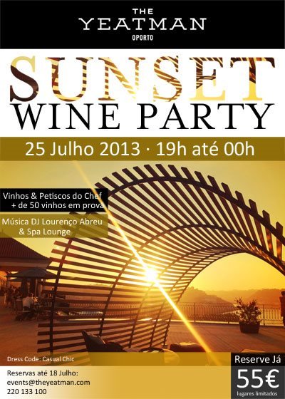 “Um final de tarde com o pôr-do-sol sobre a cidade do Porto, música e uma aprimorada selecção dos sabores de verão, com mais de 50 vinhos de excelência e propostas gastronómicas leves e frescas, são os ingredientes principais da Sunset Wine Party do The Yeatman, que acontece no próximo dia 25 de Julho. (…) A festa contará com uma seleção dos melhores vinhos para o verão dos Wine Partners do The Yeatman (…) A degustação destes néctares, selecionados criteriosamente por Beatriz Machado, directora de vinhos do The Yeatman, encontra a harmonização perfeita com as diversas iguarias do Chefe Ricardo Costa, num buffet exclusivo para um desfile de sabores únicos!”