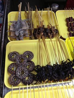 Como fazemos habitualmente em todos os locais que visitámos na Ásia tentámos comer na rua. Fomos experimentar a rua Wangfujing onde se concentram bancadas de produtos típicos, recordações e muita comida. Bem, eles por aqui chamam-lhe comida. No meu caso, eu teria que estar há três anos numa ilha deserta sem comer para experimentar algumas das iguarias.