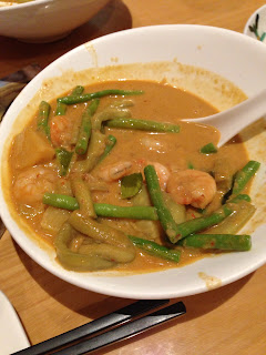 Os mais de 15 empregados do restaurante dividiam-se pelas mesas desocupadas a dormir a sesta com a cabeça pousada sobre o braço. Os poucos que não estavam na suposta hora de descanso discutiam para decidir quem ia atender a mesa dos clientes ocidentais que estavam à espera há 10 minutos. Ponderámos desistir da espera e procurar outro restaurante mas isso seria deixar que nos vencessem pelo cansaço e que ficassem satisfeitos com a nossa decisão por isso decidimos aguardar. Entretanto uma das empregadas veio registar o pedido e depois de tentarmos que entendesse o nosso Inglês acabamos por apontar no menu o que queríamos almoçar. Caril de camarão, noodles com almôndegas, frango panado com molho de amendoím e arroz frito com ananás chegaram à mesa com um aroma delicioso. Muito melhor o sabor do que o aspecto, a mistura de ingredientes e especiarias é de comer e chorar por mais. Quando quiserem comer bem na Ásia, recomendo a comida Tailandesa como primeira escolha. Ou Sushi, se o restaurante aparentar ter peixe bem fresco, claro.