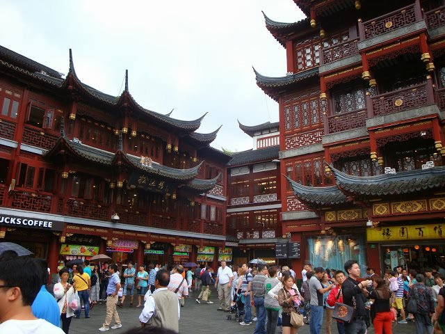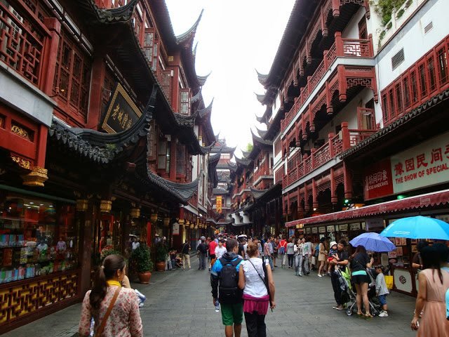 No primeiro dia embarcámos num tour pela cidade num autocarro de citysightseeing e almoçámos na zona de Huangpu, junto ao Yu Garden. Aqui todos os edifícios apresentam o aspecto tradicional típico de Shanghai e encontrámos diversas ruelas de lojas variadas e restaurantes típicos. Escolhemos obviamente o que é considerado um dos melhores restaurante de dumplings de Shanghai, o Nanxiang Mantou. Os dumplings são pequenos bolos de uma massa idêntica ao revestimento dos rissóis e no interior têm um recheio que pode variar entre carne de vaca ou de frango, cogumelos, vegetais ou caranguejo e que são cozinhados a vapor. Eu não aprecio dumplings, precisamente porque o facto de serem cozinhados a vapor confere à massa uma textura estranha e deixa-me sempre a sensação de estar pouco cozinhada mas devo confessar que estes eram melhores do que os que comemos não só em Wangfujing, em Pequim como os que já tínhamos provado em Singapura.