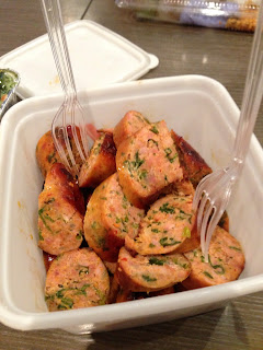 Ao contrário de outras ocasiões, deste vez não arriscámos comer de tudo em qualquer sítio porque a imunidade da Ana à toxoplasmose não inclui determinados exageros. Jantámos no food court do Siam Paragon. Escolhemos uma variedade de “tapas” locais: satay, cinnamon rolls, spicy sausage, banana grelhada, pão urso, e mais umas coisas.