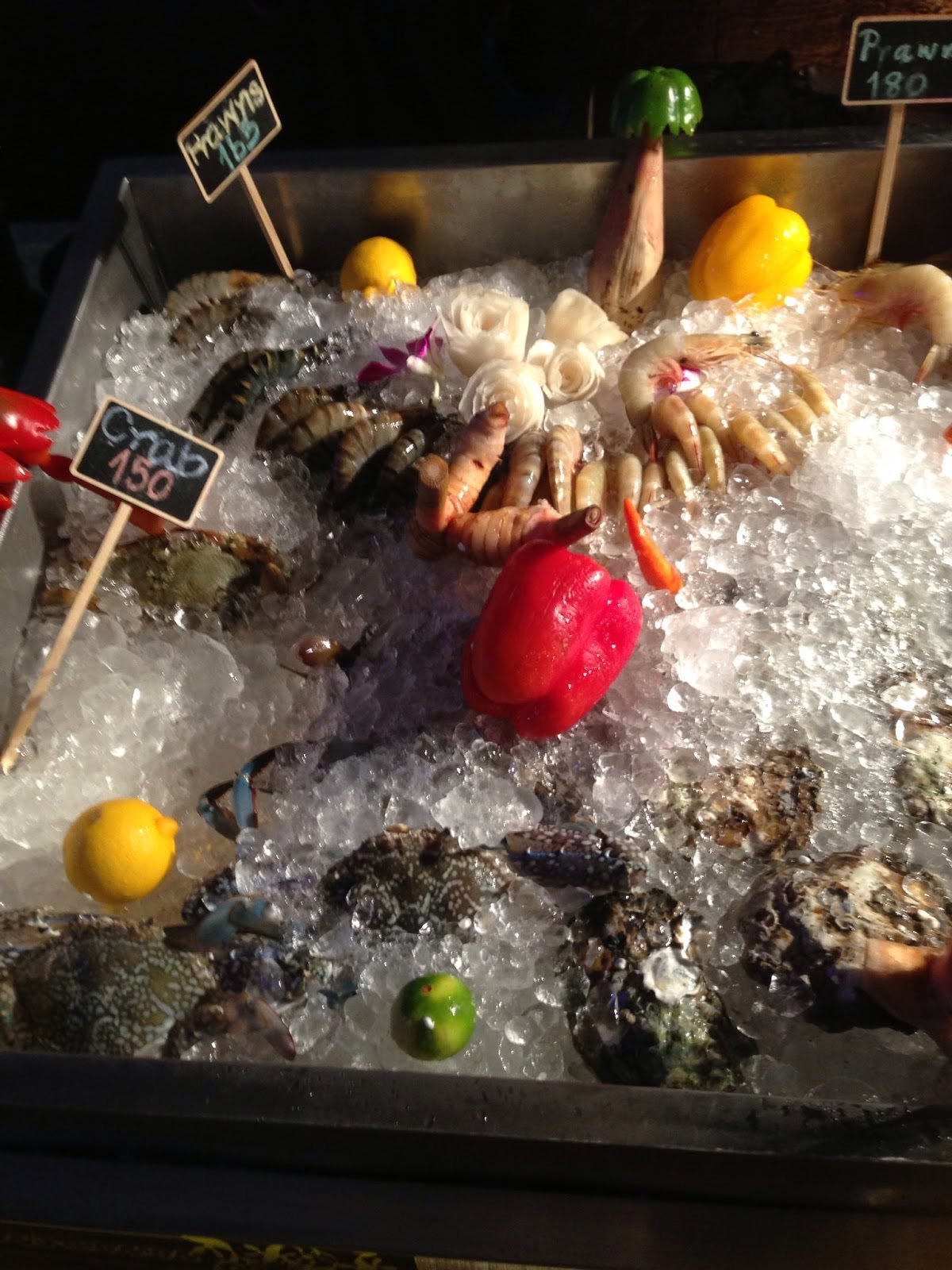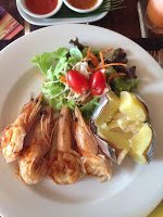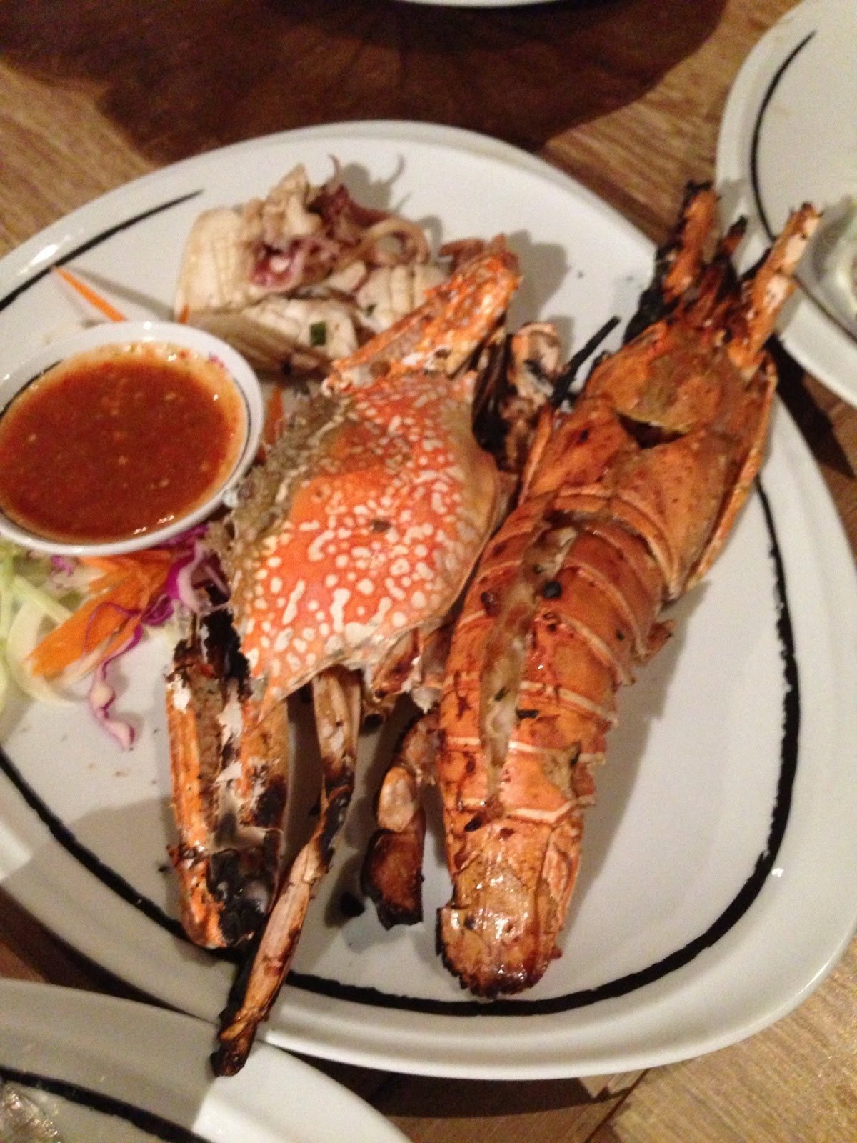 Ficámos com a sensação de que íamos ficar desiludidos com os pratos quando olhámos para o menu recheado de fotografias com aspecto de fazer babar. “Barbecue shrimps, barbecue squids, barbecue butterfish, shrimps curry and honey seafood fried rice, please!“. Felizmente percebemos que estávamos enganados quando o pedido chegou à mesa.