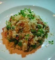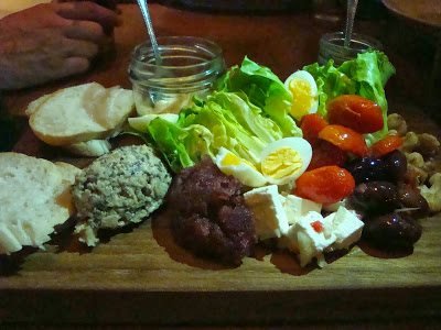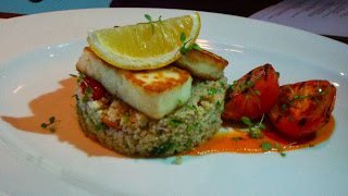 Em seguida Risotto de fiambre fumado, ervilhas e menta para dois, Arabesque: queijo halloumi grelhado na brasa com salada tabbouleh e molho de pimento vermelho para mim e o The Larder Antipasto: hummus, azeitonas kalamata, terrina de cogumelos, tostas, queijo feta e salada para a Ana partilhar com o Tomás.