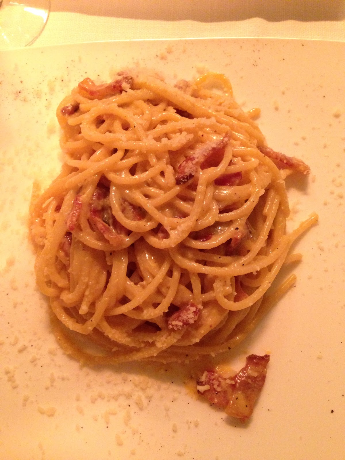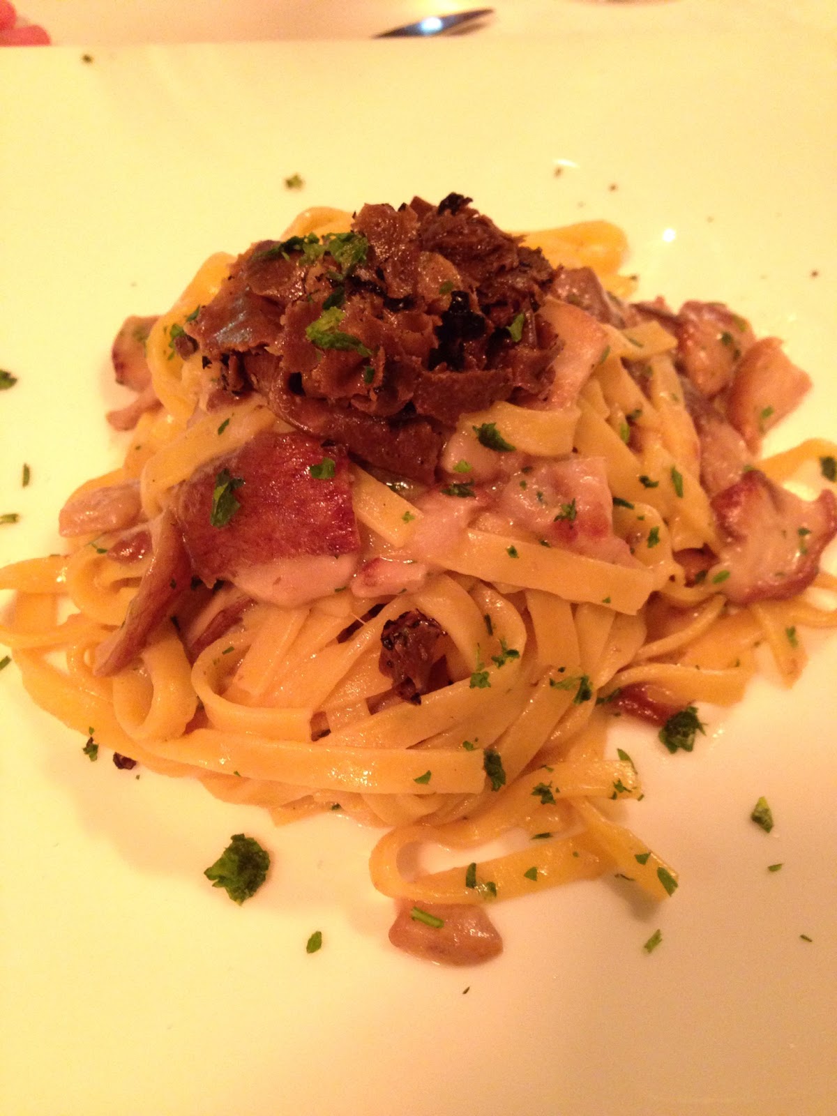 Pedimos focaccia al rosmarino, spaghetti alla carbonara, fettuccine con funghi porcini e tartufo nero, ravioli ripieni di burrata con vellutata di parmigiano e tartufo nero e um fresco Chardonnay. A noite estava fria mas a esplanada aquecida convidava a disfrutar a refeição sob o céu estrelado.