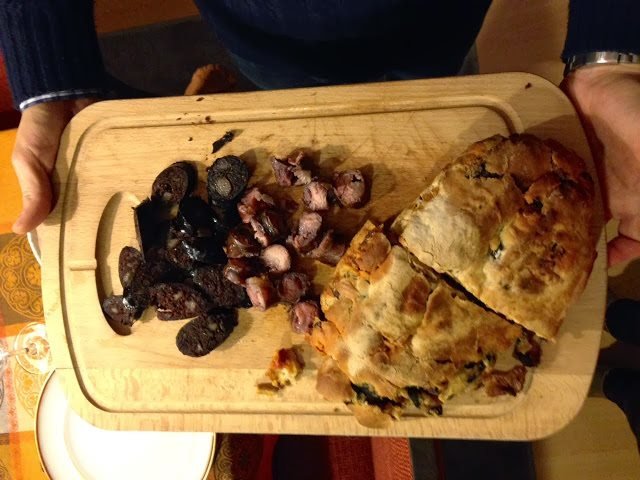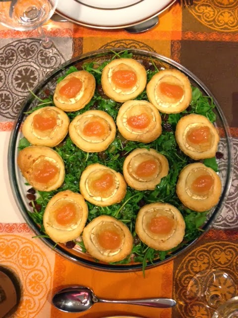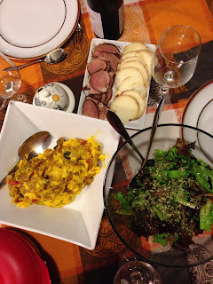 Dedicámo-nos aos cozinhados e partimos para casa dos Maias. A agitação na cozinha concentrava-se à volta do fogão. As maravilhosas mãos do Hugo e da Leninha preparavam uns ovos revueltos com alheira, pimentos e cogumelos, calamares estaladiços e apetitosos e batatas (bem) bravas. Juntámos à festa um queijinho de cabra gratinado com marmelada em massa folhada e sobre cama de rúcula (plágio do Andor Violeta), cogumelos salteados, lascas de bacalhau com batata palha e ovo e também migas de farinheira e couve galega. Mais tarde chegaram o Pedro e a Marlene com enchidos de primeira categoria e broa com chouriço e azeitonas.