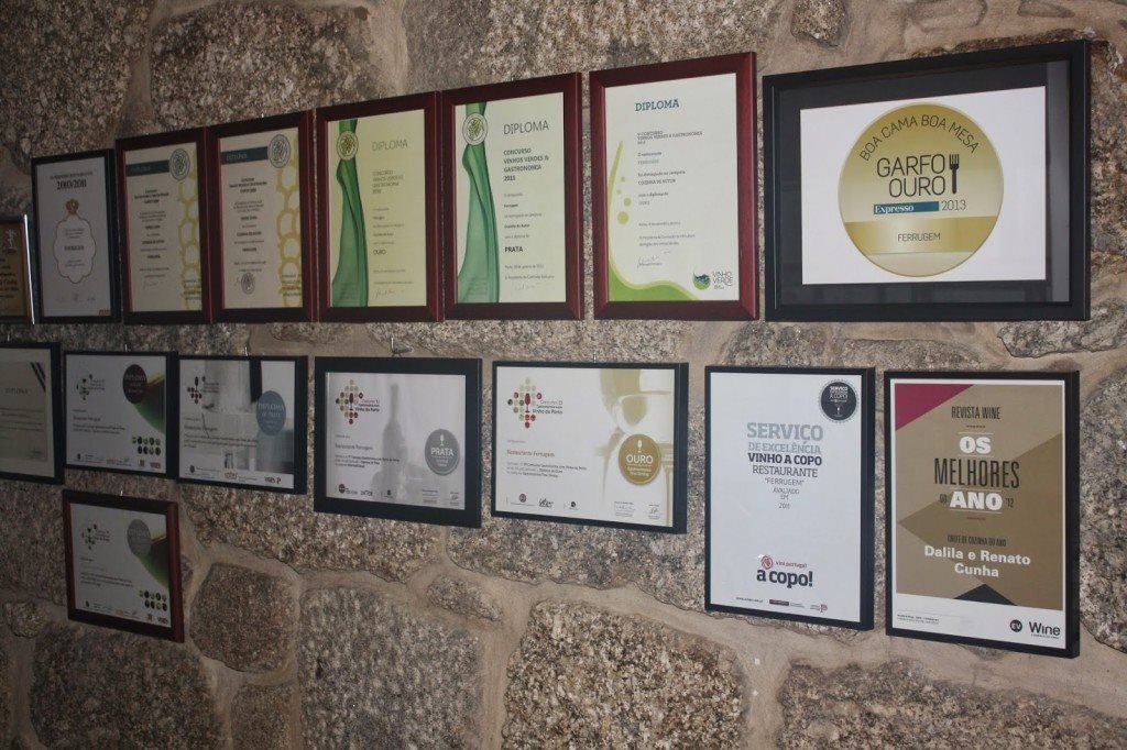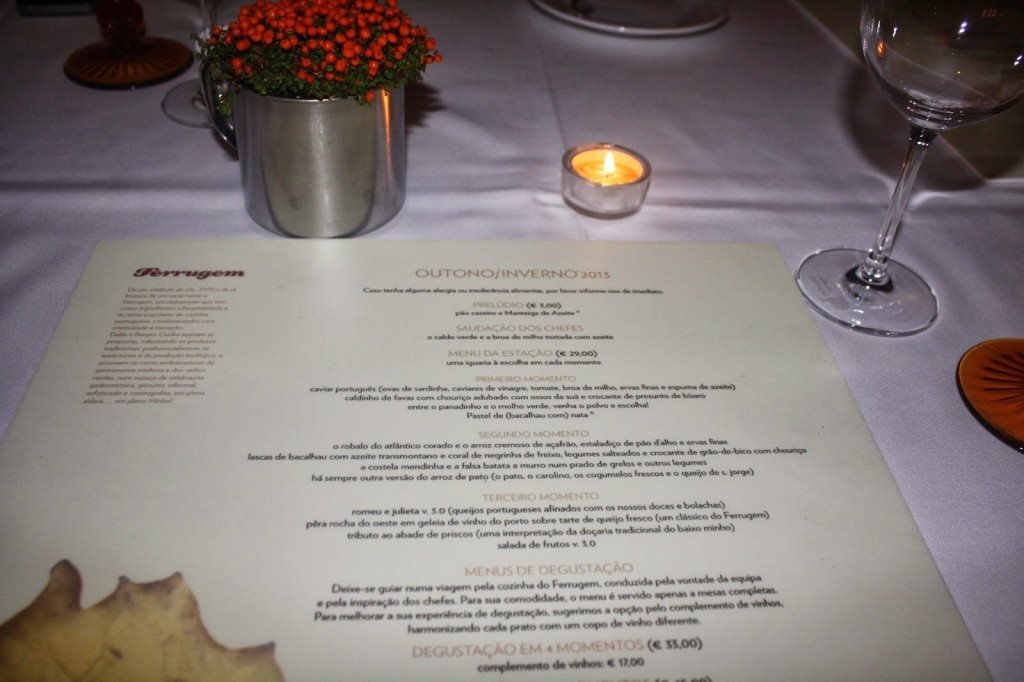 No menu pudemos descobrir algumas curiosidades sobre o restaurante: “De um estábulo do séc. XVIII e da sã loucura de um casal nasce o Ferrugem, um restaurante que tem como ingredientes a hospitalidade e as raízes populares da cozinha portuguesa, condimentados com criatividade e inovação. Dalila e Renato Cunha assinam as propostas, valorizando os produtos tradicionais, preferencialmente os autóctones e de produção biológica, e assumem-se como embaixadores da gastronomia minhota e dos vinhos verdes, num espaço de celebração gastronómica, genuíno, informal, sofisticado e cosmopolita, em plena aldeia, … em pleno Minho!”