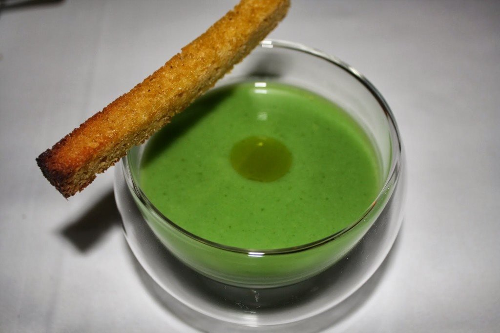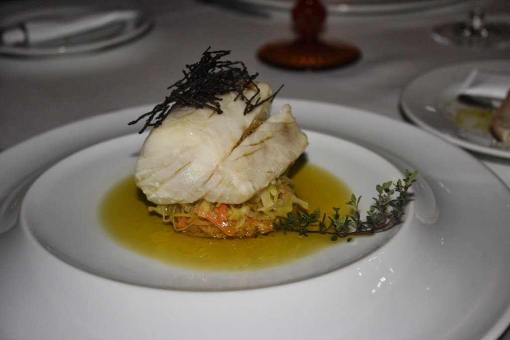 Começámos a refeição com pão fatiado acompanhado da tal manteiga e, enquanto apreciavamos o menu, foi servido um caldo verde e broa de milho tostada com azeite. Saudação do chef. Mais Português que isto só se estivéssemos todos a jantar com o cachecol da Selecção Nacional ao pescoço…