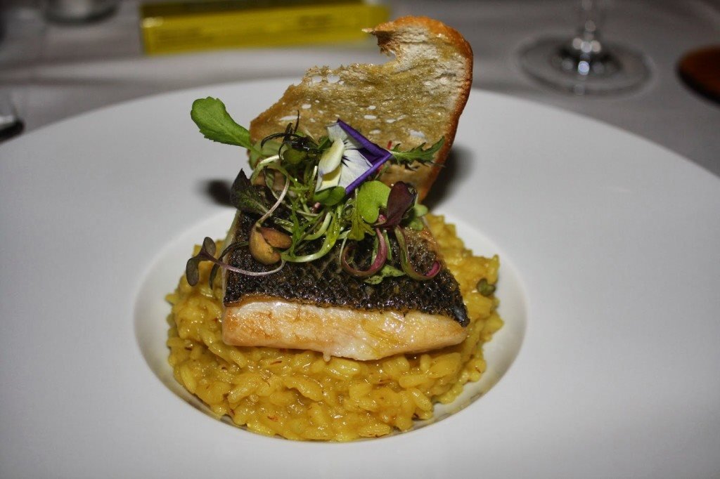 Num segundo momento optámos todos pelos pratos de peixe: robalo do atlântico corado e arroz cremoso de açafrão, estaladiço de pão d’alho e ervas finas e lascas de bacalhau com azeite transmontano e coral de negrinha de freixo, legumes salteados e crocante de grão-de-bico com chouriço. Maravilhooooooso…