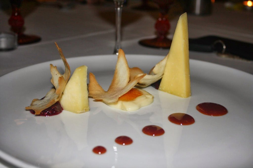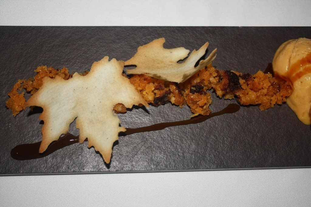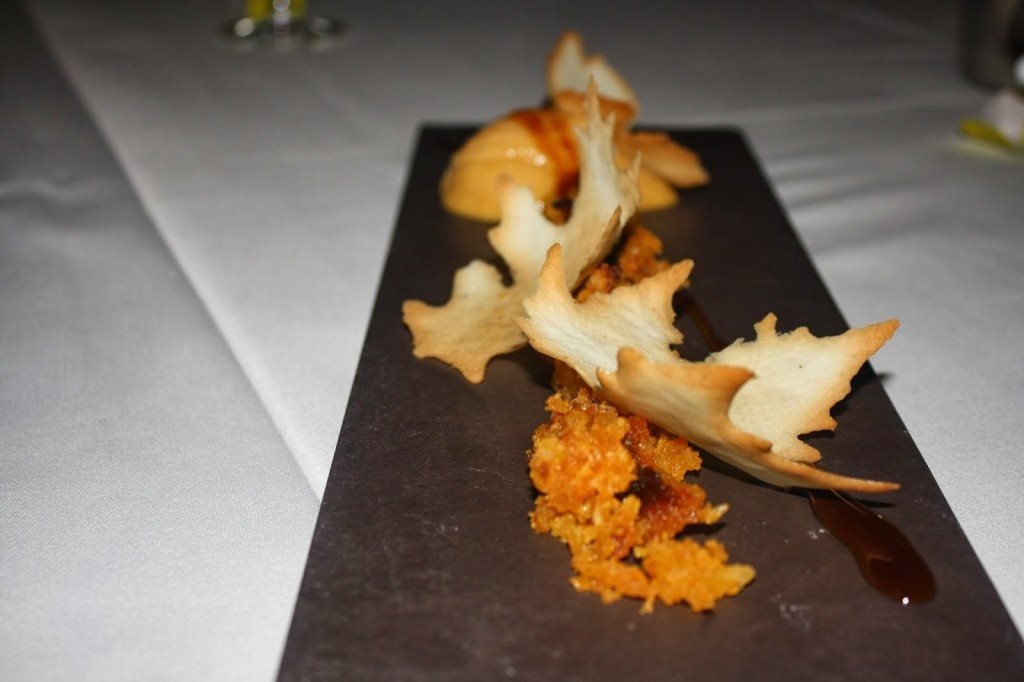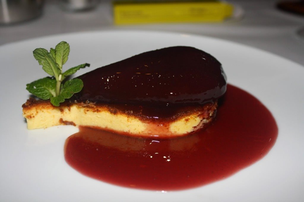 Para terminar, arte em forma de sobremesa: Romeu e Julieta v. 3.0 (queijos portugueses afinados com os nossos doces e bolachas), pêra rocha do oeste em geleia de vinho do porto sobre tarte de queijo fresco (um clássico do Ferrugem) e um tributo ao abade de priscos (uma interpretação da doçaria tradicional do baixo minho). O Nuno já me estava a rogar uma praga porque estive uma eternidade de tempo a tirar fotografias ao “pudim” abade de priscos que de pudim não tinha nada mas transbordava de beleza e requinte de um prato digno de uma estrelinha Michelin.