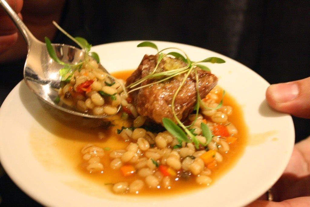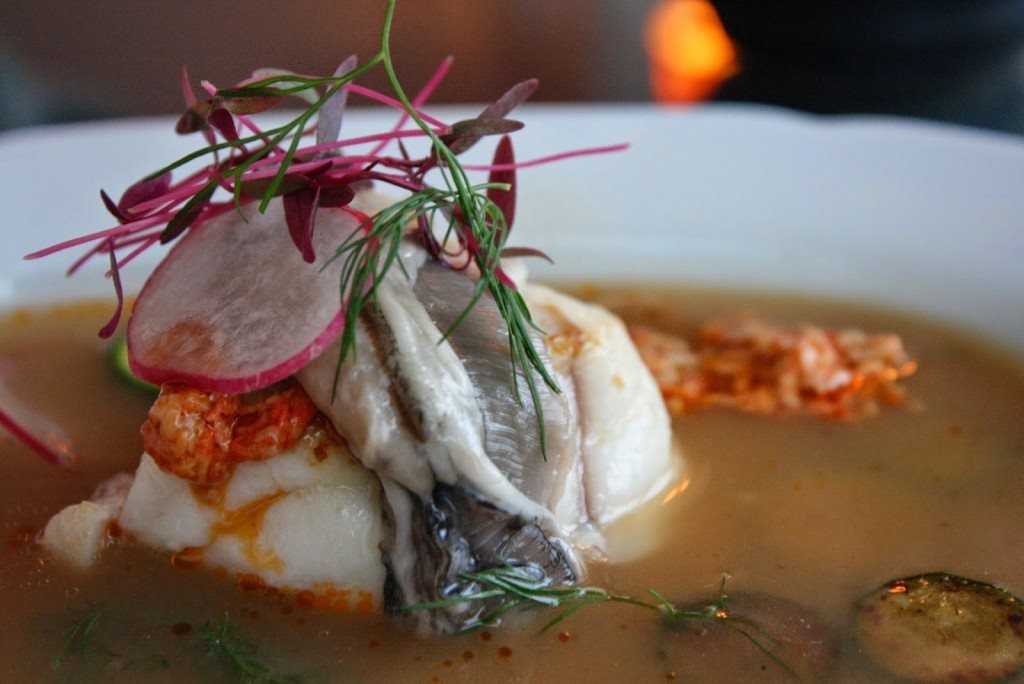Tamboril e ostras, estufados de legumes em caldo de mar e terra