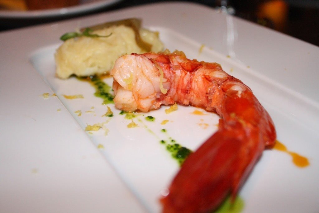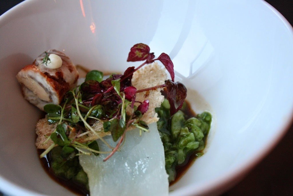 Carabineiro, bacalhau, alcachofras, azeite de chouriço e azeite de salsa
