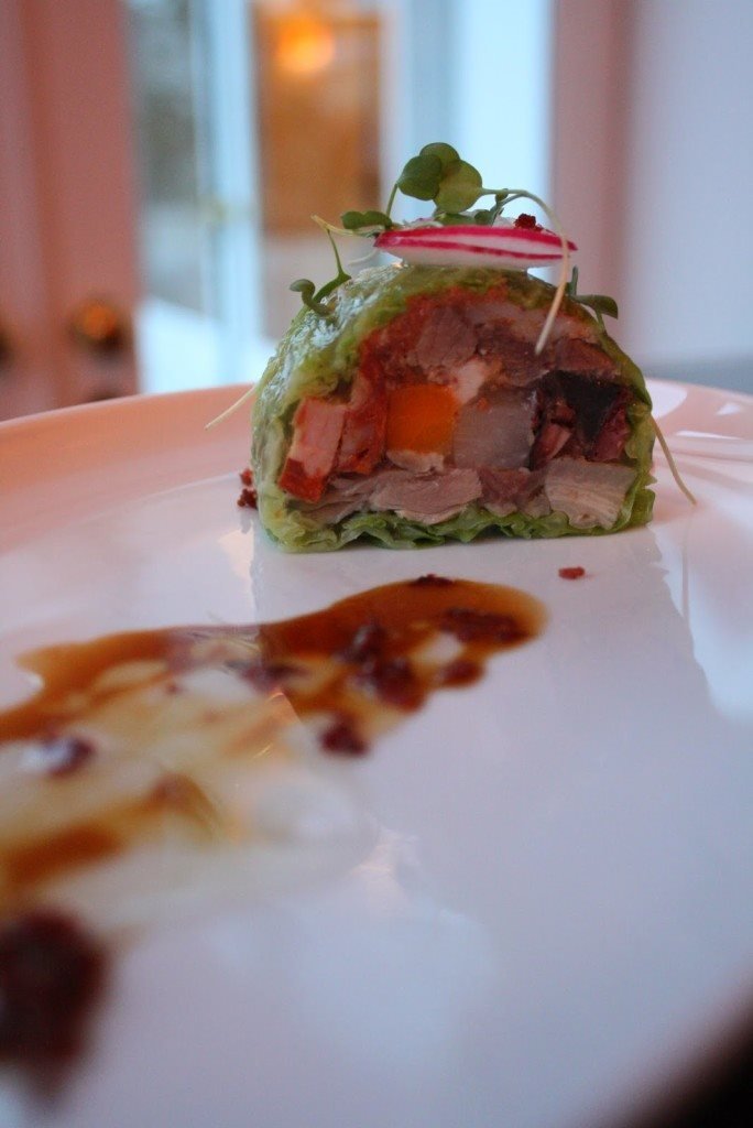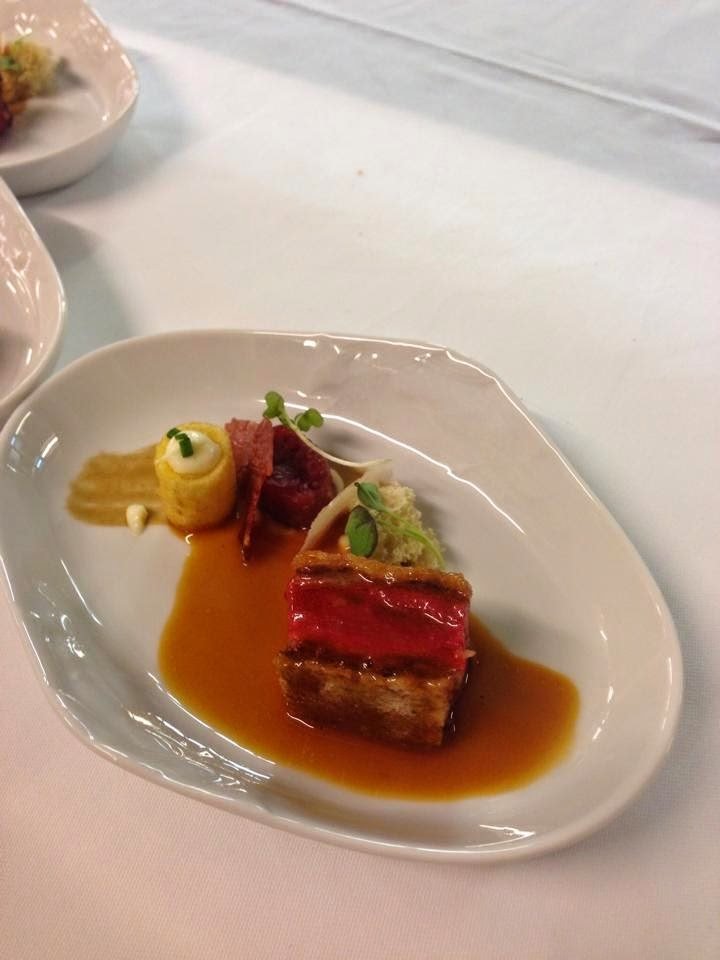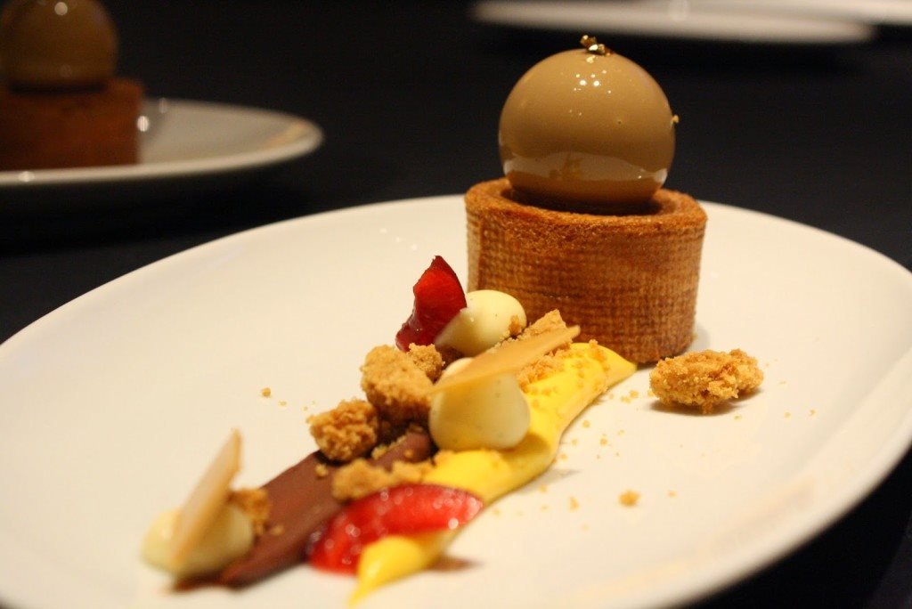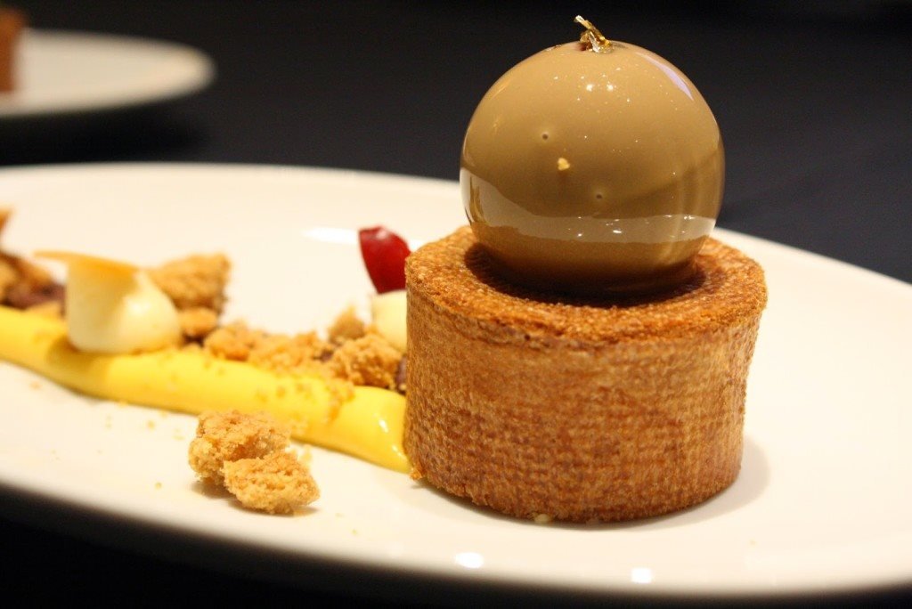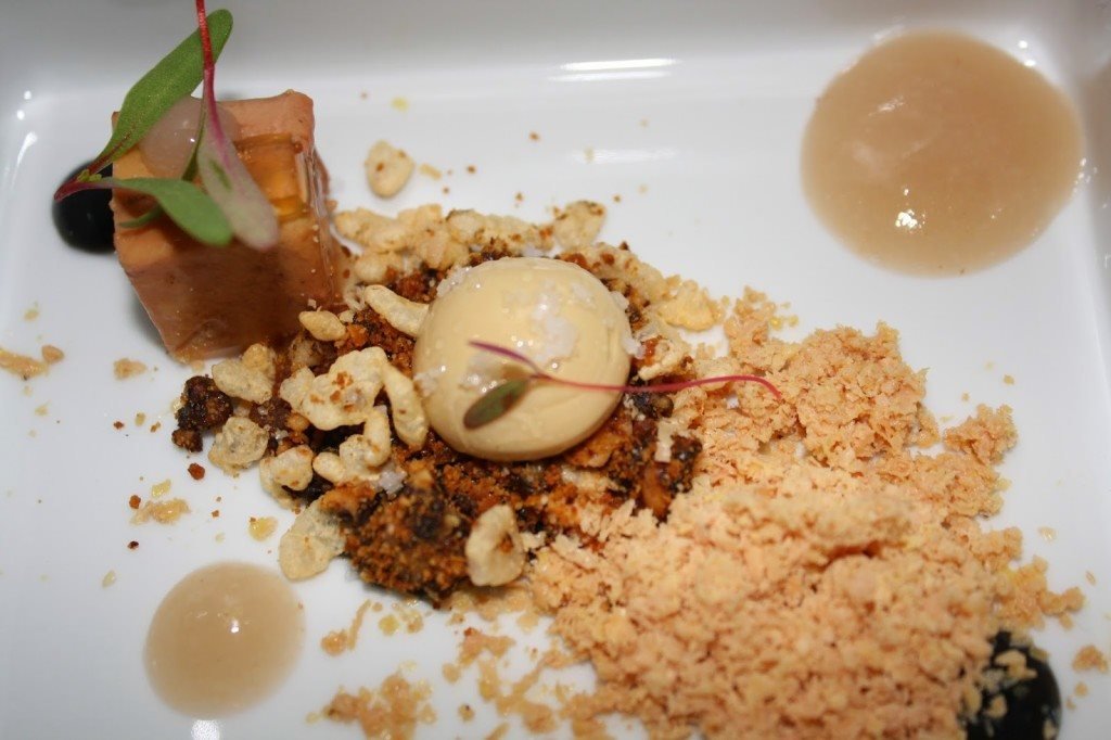 Sensação de foie gras, pêra rocha e vinho da Madeira, bolo de mel e nozes caramelizadas