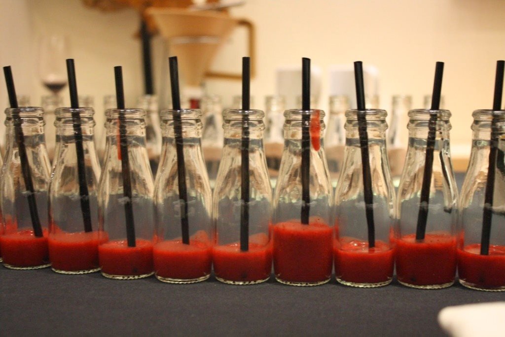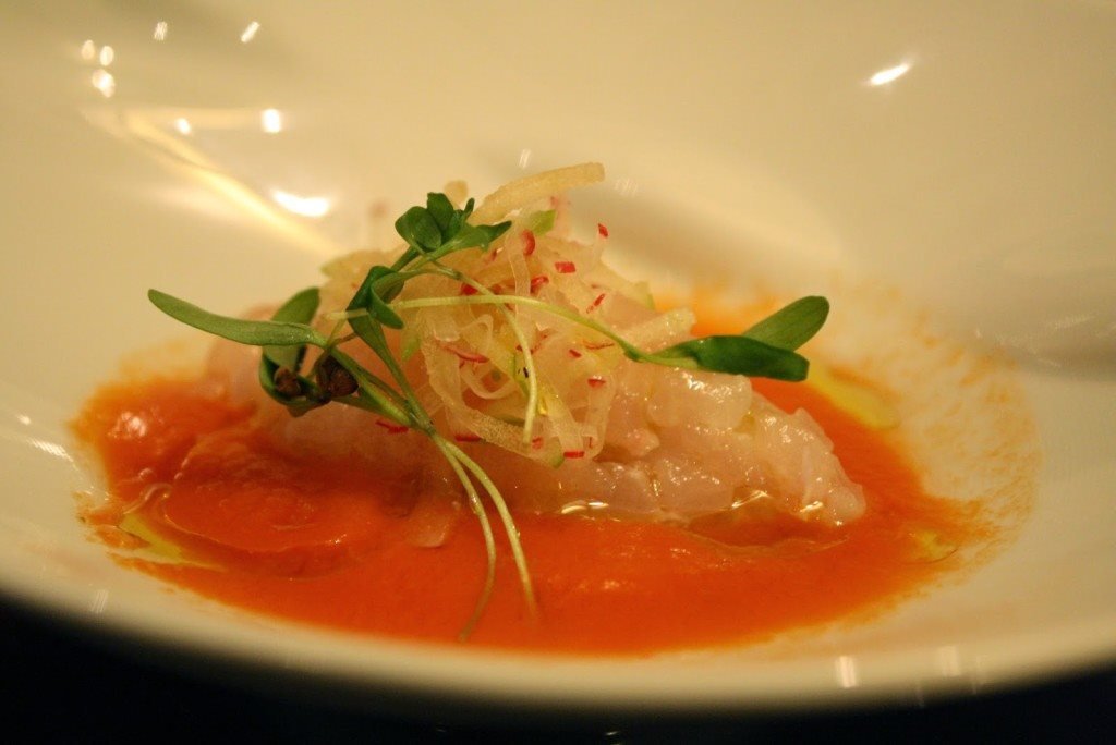 Creme frio de tomate e erva príncipe com robalo marinado e gengibre