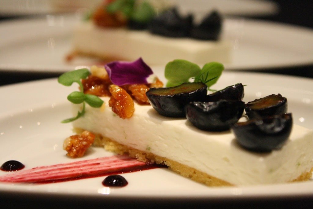 Gazpacho de mirtilos e cheesecake de mirtilos, lima e gelado de iogurte.