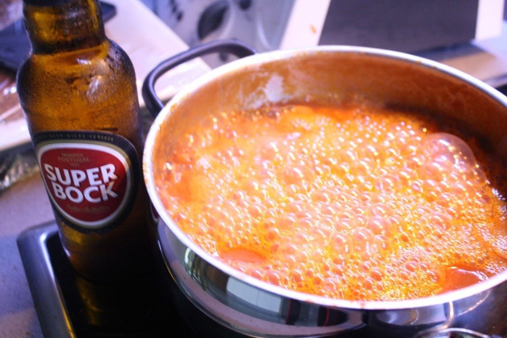 Junta a carne e deixa cozinhar um pouco (5 minutos). Acrescenta a cerveja, mexe periodicamente e mantém o lume médio. Deve cozinhar idealmente durante 45 minutos para que a carne fique bem tenra.