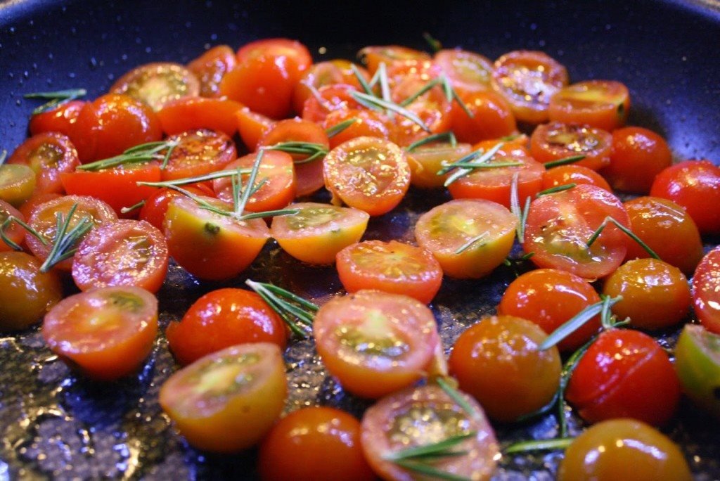À parte, numa sertã ou num wook salteia os tomates em azeite, sal e alecrim aos molhos.