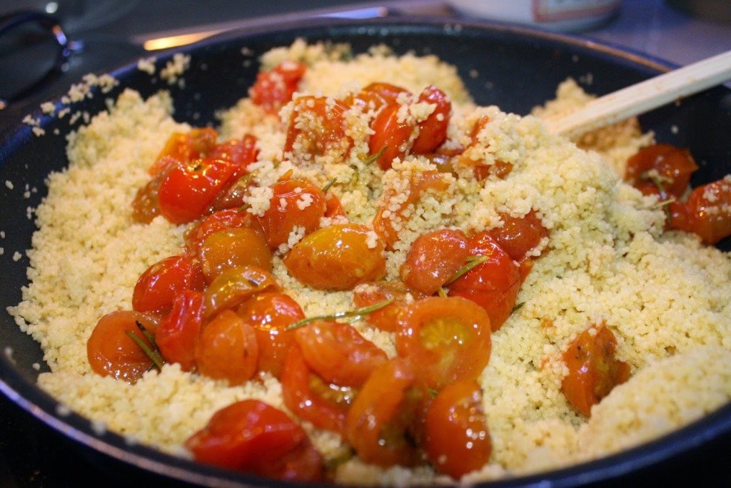 Passado o tempo de repouso, coloca os couscous nos restos de azeite (adiciona mais um pouco) utilizado para saltear os tomates e deixa cozinhar em lume brando mexendo sempre. Ficam com um aspecto húmido e brilhante realmente apetitoso. Junta os tomates e está pronto a servir.