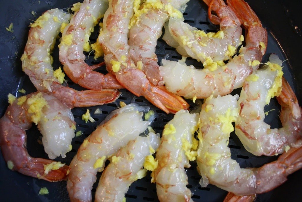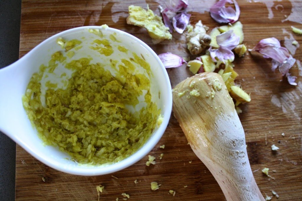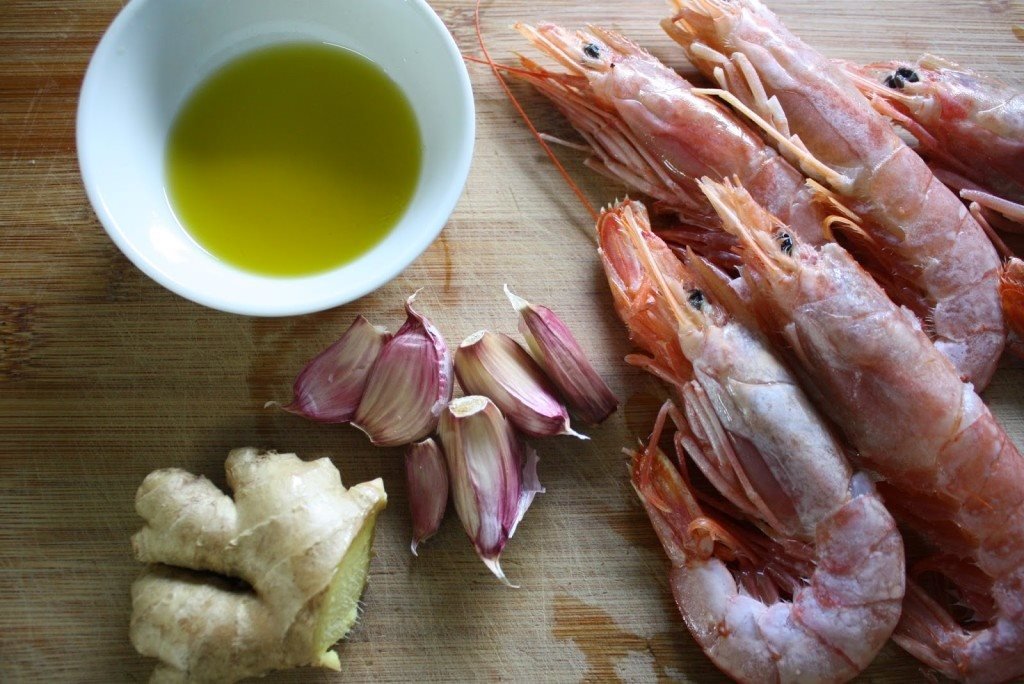 Em seguida prepara o condimento para as gambas: num almofariz coloca 4 dentes de alho ralados grosseiramente num raspador juntamente com o gengibre ralado da mesma forma e uma pitada de sal grosso. Adiciona uma pequena porção de azeite e liberta a energia com o auxilio de um pilão. Atenção, tem que ser um pilão de categoria. Toda a gente sabe que faz toda a diferença…