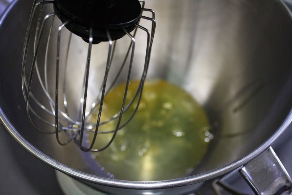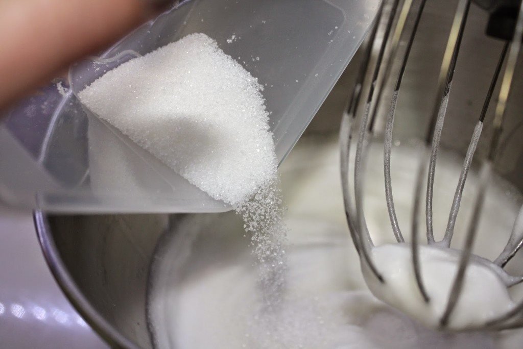 Separa as claras das gemas. Bate as claras em castelo com uma pitada de sal. Antes de estarem bem firmes adiciona 20g de açúcar e continua a bater até ficarem com consistência de merengue.