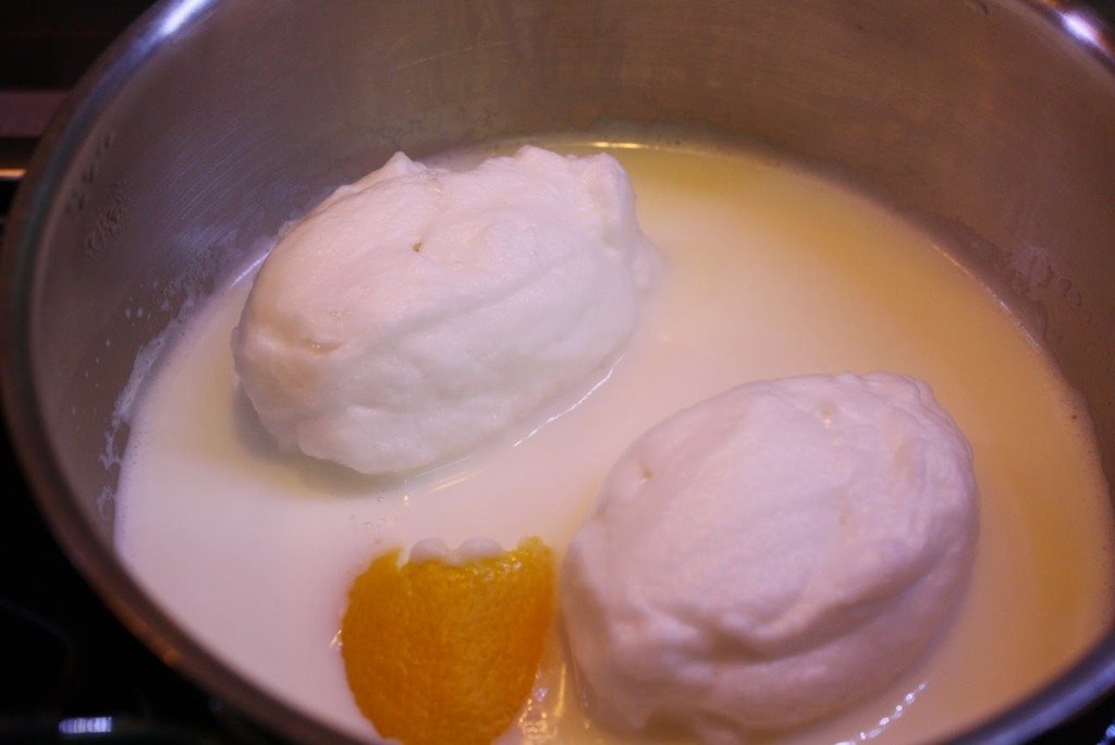 Aquece o leite com a casca de limão a temperatura média sem ferver e de forma a evitar que se formem bolhinhas de ar. Retira a casca de limão. Molda o merengue com duas colheres de sopa (tipo bolinhos de bacalhau) e coloca no leite. Deixa cozer durante um minuto de cada lado e vai virando com cuidado. Retira e reserva.