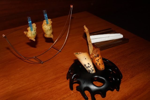 Fomos presenteados com uns amuse bouche de Grissini, Cones de salmão com queijo creme e Estendal de Pataniscas de Bacalhau a fazer lembrar a roupa a secar ao sol muito ao estilo do famoso prato do Chef Ljubomir Stanisic do 100 Maneiras… Plágio gastronómico? Quem terá sido o primeiro autor?