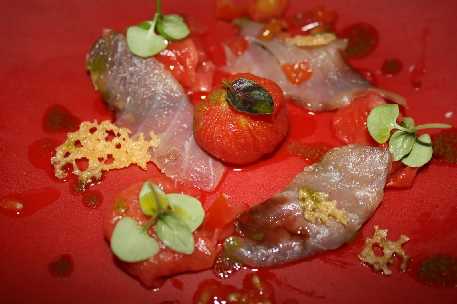 Para iniciar, como cortesia do chef, Sardinha fumada com carpaccio de melancia.