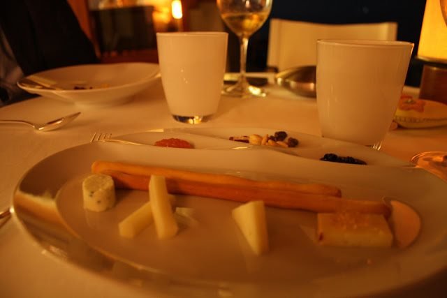 Fomos presenteados com uns amuse bouche de Grissini, Cones de salmão com queijo creme e Estendal de Pataniscas de Bacalhau a fazer lembrar a roupa a secar ao sol muito ao estilo do famoso prato do Chef Ljubomir Stanisic do 100 Maneiras… Plágio gastronómico? Quem terá sido o primeiro autor?